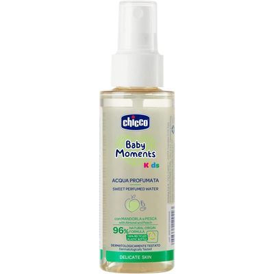 El agua perfumada Baby Moments de Chicco está creada con un 96 % de ingredientes naturales y no contiene alcohol. Esta agua perfumada está enriquecida con extracto de almendras dulces y melocotón, que aportan una fragancia suave y agradable que completa la rutina de higiene del bebé. Se puede usar después del baño, la ducha o en cualquier momento del día. Sin embargo, no se debe rociar sobre los ojos para evitar molestias o irritaciones.