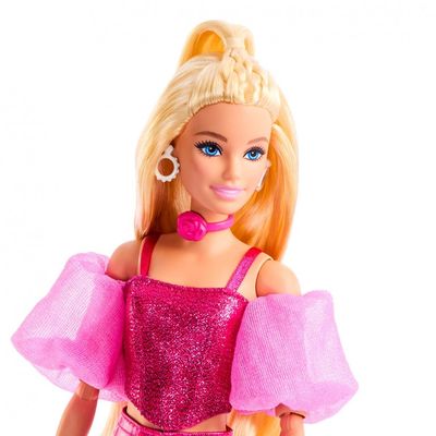 metalizada. ¡Esta muñeca Barbie resplandece en rosa de pies a cabeza! Su brillante