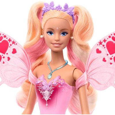 creando magia de color. Esta muñeca Barbie Hada brilla con su vestido, tacones