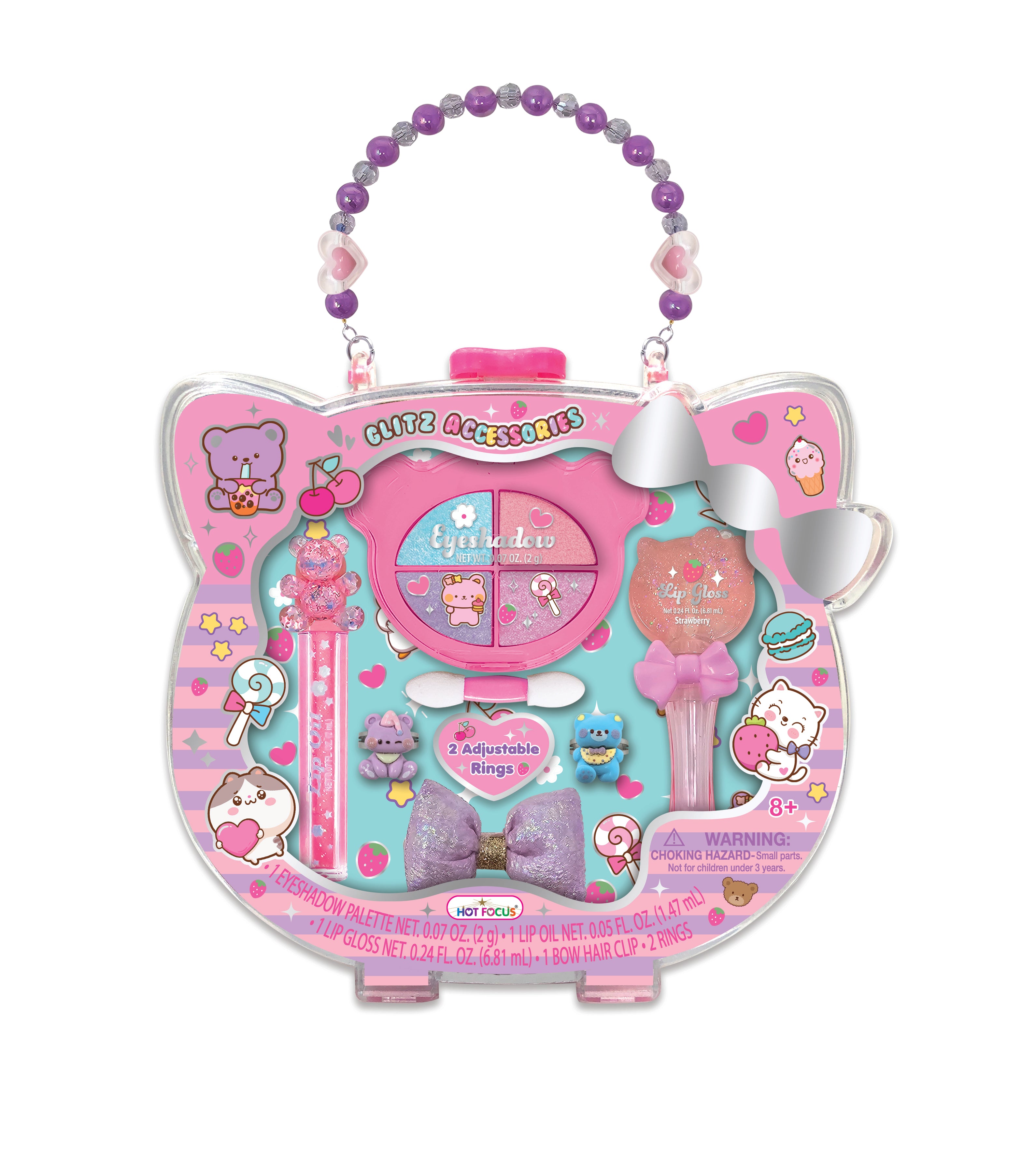 y accesorios, como sombras de ojos, brillo labial, esmalte de uñas, y pegatinas.