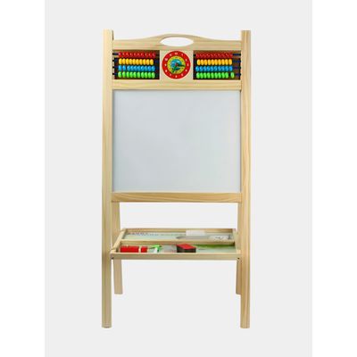 Caballete doble cara de madera ideal para el aprendizaje creativo y matemático. Incluye un ábaco de colores y un reloj educativo, perfectos para desarrollar habilidades numéricas y de coordinación. Su superficie blanca es ideal para escribir y dibujar con marcadores borrables.