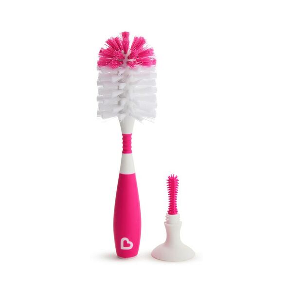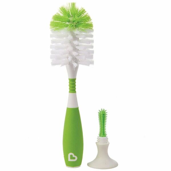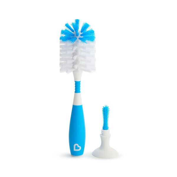 El cepillo de botellas Munchkin Bristle™ cuenta con una base de ventosa patentada, por lo que cuando se frega, simplemente lo colocas en la encimera para mantenerlo erguido, de secado rápido y lejos de gérmenes. El mango antideslizante le da a las manos jabonosas un agarre firme y las robustas cerdas de nylon son resistentes a la suciedad, pero suaves en los biberones del bebé. Dado que nadie tiene tiempo para arrojar agua jabonosa alrededor de la cocina, incluso desarrollamos nuestras cerdas para reducir el temido chapoteo cuando sale de la abertura de la botella. Sabemos que los biberones vienen en todas las formas y tamaños, así que añadimos un nuevo cuello flexible para ayudar a entrar en cada biberón con facilidad.