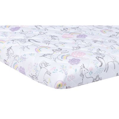 Mantén el patio de juegos de tu pequeño cómodo con la sábana para patio de juegos Playful Unicorns Jersey de Trend Lab. La tela de jersey de algodón peinado 100 % acolchada tiene la cantidad justa de relleno para un poco de amortiguación adicional en el corralito. Este estampado es una mezcla adorable de unicornios felices, arcoíris de colores, nubes y flores en rosa claro, morado, amarillo, verde azulado y gris oscuro sobre un fondo blanco.
