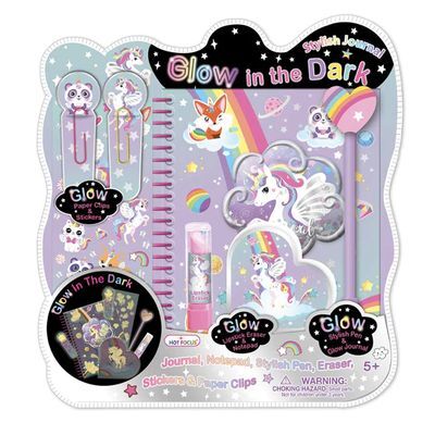 Set de libreta, pluma y stickers con diseño de unicornio y gatito que brillan en la oscuridad. También incluye clips y un lindo labial.