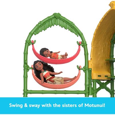 Inspirado en Moana 2 de Disney, la secuela teatral de la película original, los niños pueden ayudar a las muñecas pequeñas de Moana y Simea a pasar tiempo fraternal junto con este juego Village Home. Estas hermanas aventureras y su amiga, Pua, el cerdo, pueden descansar, comer y jugar en su falso. El juego se abre para un juego enriquecido con dos hamacas, una canoa mecedora y una mesa. Once accesorios para contar historias (frutas, tazas, cuencos, flores para el cabello y coronas) amplían las posibilidades de jugar con detalles fieles a la película. Las muñecas no pueden estar solas.