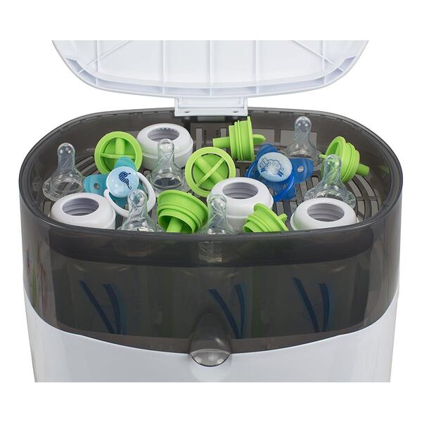 Esterilice una carga de biberones, repuestos, chupetes y más. Con controles electrónicos con indicadores de ciclo, este esterilizador de biberones de encimera es fácil de usar. En el interior hay una bandeja extraíble diseñada para colocar los biberones a la perfección, mientras que una bandeja de accesorios incorporada contiene las piezas, las tetinas y los chupetes.