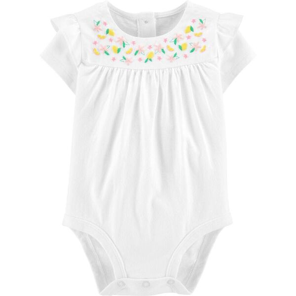 El comienzo perfecto para sus looks más encantadores, este body suave presenta divertidos detalles de volantes en los hombros y flores bordadas en el canesú.