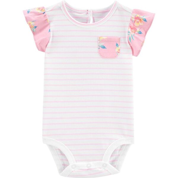 No te pierdas los encantadores detalles de este suave body, como mangas onduladas con estampado floral y bolsillo en el pecho, así como rayas en toda la prenda