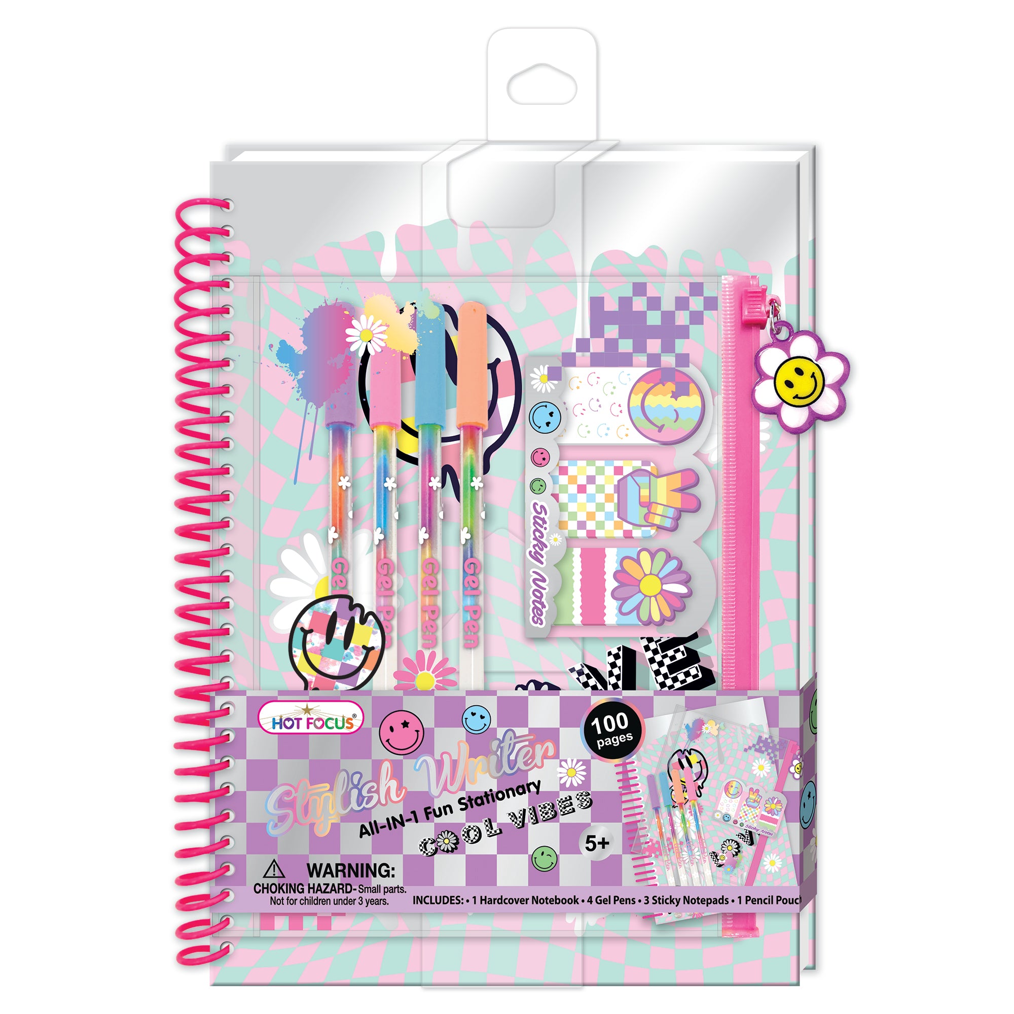 El juego de papelería más novedoso que puedas tener incluye 1 libreta de espiral, 4 bolígrafos de gel arcoíris, 3 libretas de notas adhesivas, 1 lapicera transparente con cierre para llevar tus artículos favoritos a donde quiera que vayas con un diseño muy Cool.