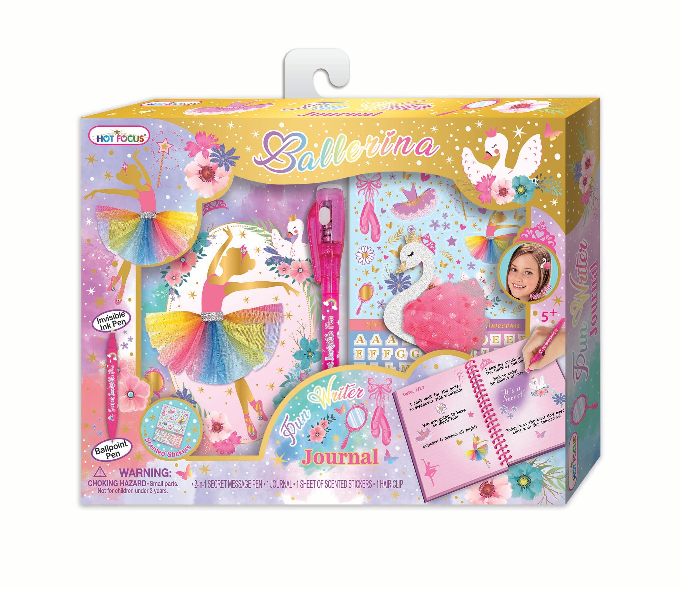 Escritora Divertida, Bellas Bailarinas. ¡Escribir es divertido! A los niños les encanta el bolígrafo de dos puntas para mensajes secretos, que les permite mantener sus mensajes seguros. Contiene: 1 diario, 1 bolígrafo dos en uno para mensajes secretos, 1 hoja de pegatinas perfumadas y 1 pinza para el pelo.