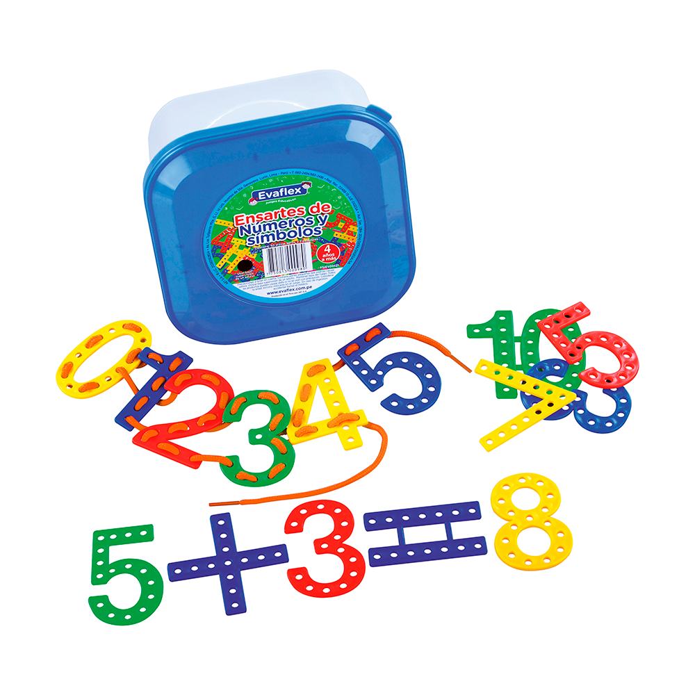 El juego de ensartes de números y símbolos está diseñado para ejercitar la coordinación visomotora y reforzar el aprendizaje de números y signos matemáticos. Permite realizar actividades de seriación por color, número y símbolo, favoreciendo el desarrollo cognitivo y motriz.