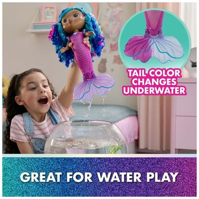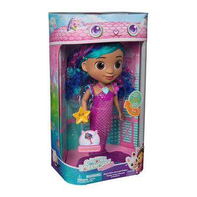 Inspirada en la película Gabby’s Dollhouse: The Movie, esta muñeca transformada en sirena deslumbra con su cola luminosa que brilla con colores del arcoíris y su espectacular cabello azul con mechones rosas.