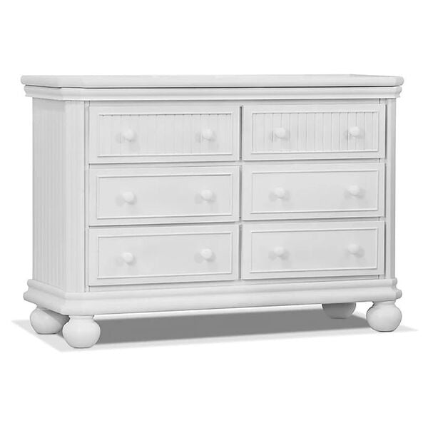 Gavetero 6 Gavetas Doble Finley BlancoDale a tu guardería un aspecto relajado con el estilo inspirado en una cabaña de la colección de muebles para guardería Finley de Sorelle. La cómoda doble Finley cuenta con 6 cajones espaciosos para la ropa, hermosos detalles acanalados y llamativos pies en forma de moño.