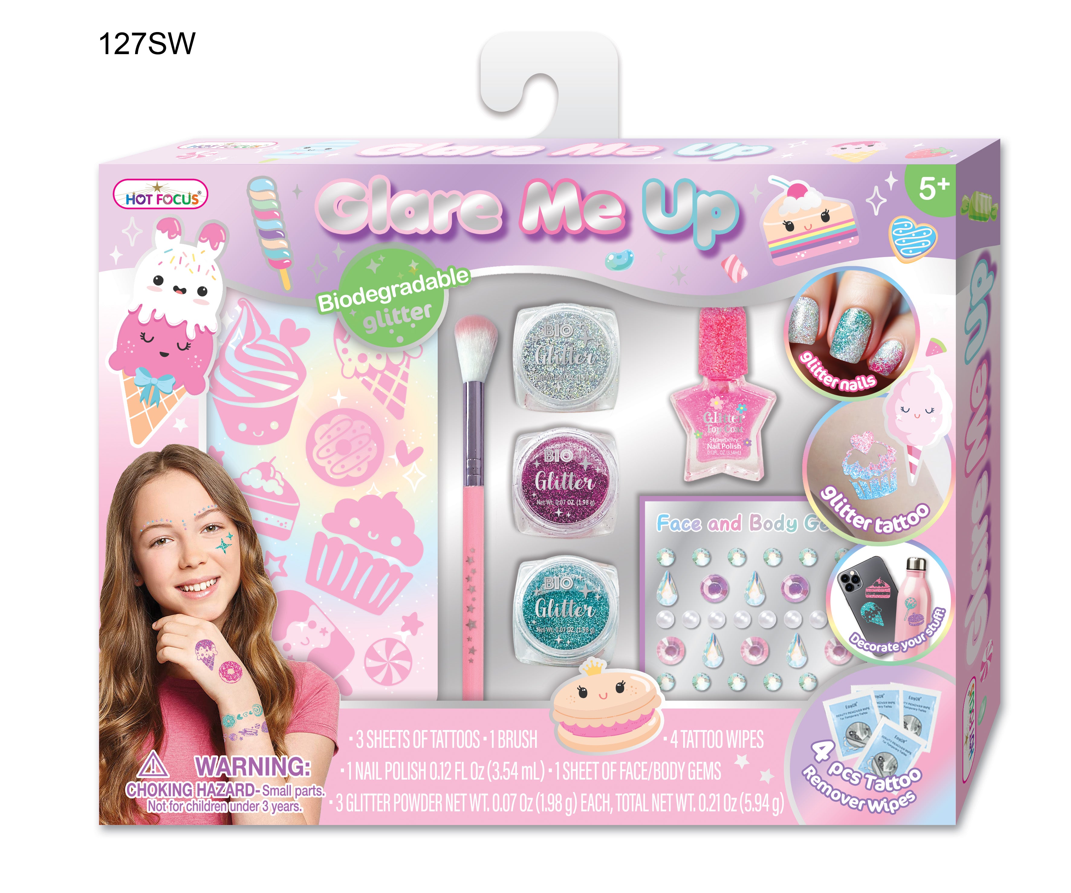 Un adorable kit de cosméticos que incluye una lámina de pegatinas faciales y corporales, un esmalte de uñas, polvos de brillantina y láminas de tatuajes temporales es el regalo perfecto. Tu peque disfrutará organizando maquillajes para sus amigos con este kit brillante. Los polvos de brillantina son biodegradables, lo que facilita su descomposición.