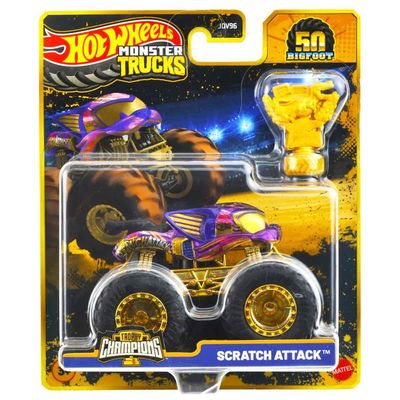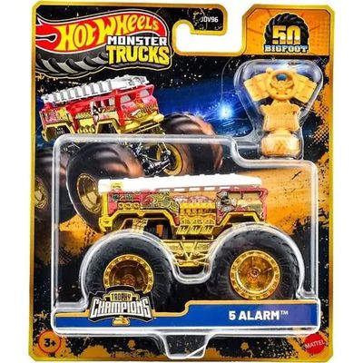dorado. También incluye un trofeo del campeonato Hot Wheels Monster Trucks
