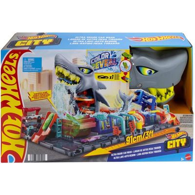 Como se ve en la serie de Netflix \"¡A correr!\", el autolavado Hot Wheels City ha sido invadido por un enorme tiburón que busca sumergirse en una acción que cambia de color. Los niños conducen el vehículo Color Reveal incluido por la rampa hasta la boca del tiburón, luego presionan la cabeza del tiburón para cambiar el color del agua y revelar la decoración del auto. Al acercarte al tiburón, observas cómo el auto se desliza por su interior mientras el agua sobrante se drena. Toca la cola del tiburón para lanzar los autos desde el estacionamiento o al tanque de agua helada para una sorpresa de cambio de color. Vuelve a lavar el auto para que recupere su color original. La pista detallada en la base mejora la narrativa con puertas móviles y un rodillo de espuma, igual que en un autolavado real. El set se pliega por la mitad para facilitar su almacenamiento e incluye un asa para transportarlo y drenar el agua sobrante. Incluye un vehículo Hot Wheels Color Reveal. Los colores y las decoraciones pueden variar.
