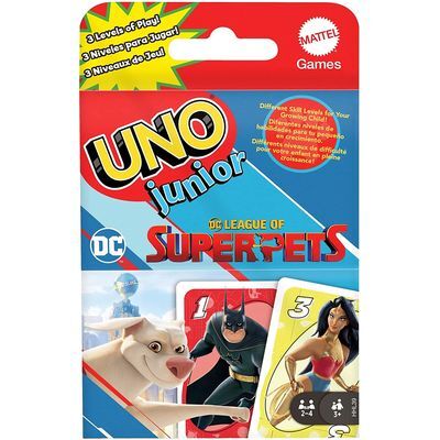 Es UNO Junior, el juego de cartas a juego diseñado para los más pequeños, con gráficos de DC League of Super-Pets! Los jugadores todavía corren para deshacerse de todas sus cartas combinando color, número y símbolo, pero hay diferentes niveles de habilidad para desafiarlos a medida que crecen. El nivel de principiante coincide con solo color y número, el nivel intermedio añade tarjetas de acción para aumentar el ritmo y el nivel avanzado incluye tarjetas de penalización para aumentar las apuestas. Es un gran regalo para los amantes de los juegos de cartas y los fanáticos del programa a partir de 3 años. Los colores y decoraciones pueden variar.