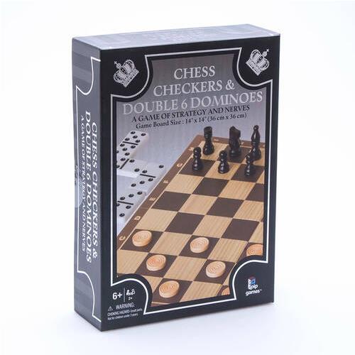 Damas - Dominó Contenido del juego: • 32 piezas de ajedrez de madera • 24 piezas de damas • 28 fichas de dominó • 1 tablero de damas plegable (tamaño completo 14 x 14 pulgadas (36 x 36 cm) • 1 instrucciones Tamaño de caja al por menor: 19 x 6.5 x 27,5 cm