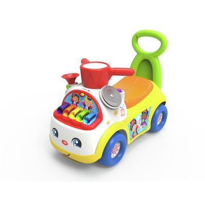 ¡música! ¡Mucha diversión! Toque el teclado para escuchar cualquiera de las 5 canciones de marcha, o cambie al modo de reproducción para crear su propia música presionando los instrumentos musicales. Luego presiona la trompeta o el tambor para añadir diversión a la diversión. ¡Vamos, el desfile está a punto de comenzar! Incluye 5 canciones de marcha diferentes. Además de sonidos de arranque y revolución del motor. También se incluye almacenamiento debajo del asiento.