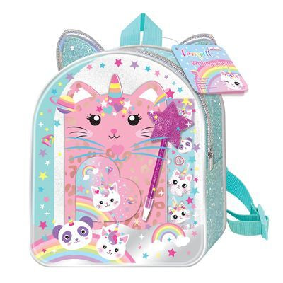 Esta mochila moderna está llena de todos los artículos de papelería divertidos que necesitas para llevar. Viene con bloc de notas, mini bloc de notas, elegante bolígrafo y pegatinas perfumadas.