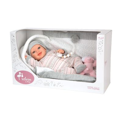 equipada con todos los accesorios que necesita un bebé reborn, como un chupete,