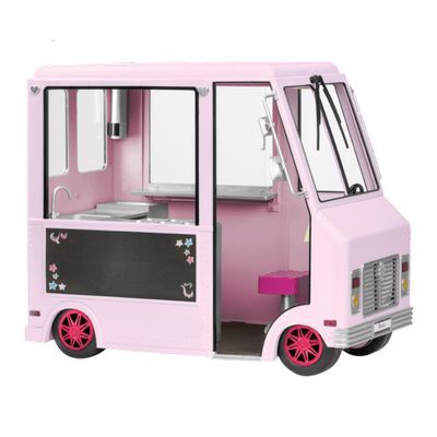 ¡Descubre el bonito juego de accesorios rosa Our Generation Sweet Stop Ice Cream Truck para muñecas de 18 pulgadas! Ganador del premio Juguete del año 2016 otorgado por Good Housekeeping y otros. Escriba especialidades del día con la pizarra real y sirva deliciosas delicias mientras viaja con una gran variedad de comida realista. ¿Lloviendo? Utilice los limpiaparabrisas que funcionan para limpiarlo. ¿Mejor clima en el malecón? Simplemente empaque su camión y conduzca a donde quiera, usando las señales de giro y las luces de freno que funcionan para conducir de manera segura.