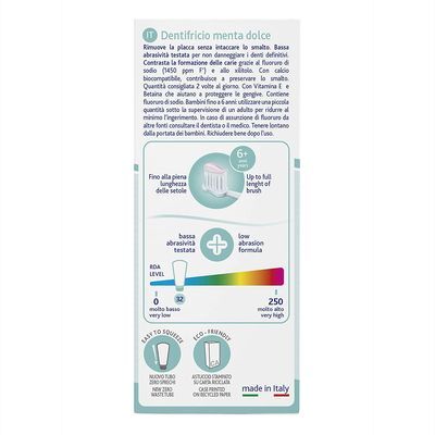 Dentífrico en grano con sabor a menta que elimina la placa sin dañar el esmalte. baja abrasividad probada para no dañar los dientes definitivos. contrarresta la formación de caries gracias al fluoruro de sodio (1450 ppm f-) y al xilitol. con calcio biocompatible, ayuda a conservar el esmalte. con Vitamina E y Betaína que ayudan a proteger las encías. Apto para niños a partir de 6 años.