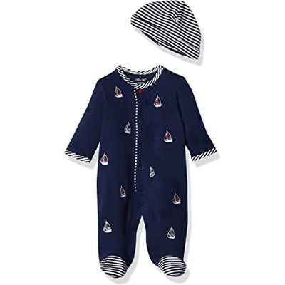 Con este footie de temática náutica, tu bebé estará cómodo y listo para la siesta. Los detalles del atuendo incluyen apliques de veleros en un adorable pie azul marino y un sombrero a rayas azul marino y blanco a juego para completar el look.