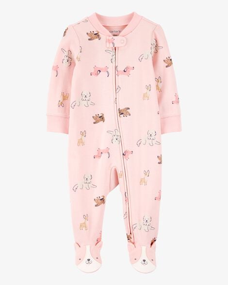 Perfecto parasiestas, juegos y risas inesperadas, este enterizo rosa pastel le da un toqueencantador con un estampado de perritos y un adorable diseño de pies. La cremallerabidireccional facilita mucho el cambio de pañales, así que los cambios demedianoche no deberían requerir una lucha. El algodón suave mantiene lacomodidad, mientras que los calcetines integrados hacen que sea una cosa menosque buscar.