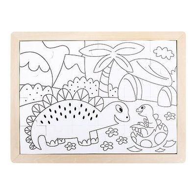 El rompecabezas de 24 piezas incluye piezas de rompecabezas coloridas y una plantilla de rompecabezas pintable en la parte posterior para que los niños coloreen. El rompecabezas está hecho de cartón y el marco está hecho de madera contrachapada.