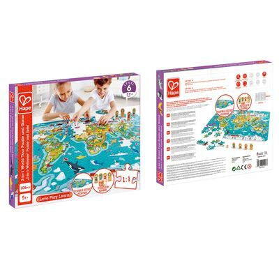 Los peques podrán realizar carreras con sus amigos por todo el mundo con este divertido juego dos en uno. Primero podrán completar el rompecabezas de 100 piezas que muestra los países del mundo con bontias ilutraciones para así aprender sobre las distintas naciones, faunas silvestres y paisajes. A continuación, podrán usar los personajes de madera para desplazarse por cada continente.