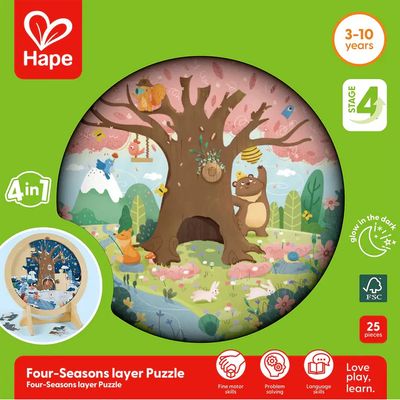 Aprende y descubre las estaciones con este increíble rompecabezas de capas de madera de Hape. Con encantadoras ilustraciones, acompaña a las criaturas del bosque mientras disfrutan de cada estación y observa cómo el gran árbol, el punto focal, cambia en cada escena.