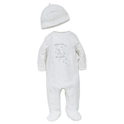 Este conjunto neutral de género de pie/sombrero está confeccionado en algodón de alta calidad para un ajuste ceñido. El atuendo cuenta con broches fáciles de cambiar desde el cuello hasta los pies, aplique de jirafa y rayas bordadas. Diseñado para usarse para dormir o jugar, este eneteriso de una pieza es un fundamental en el guardarropa de un recién nacido. ¡Vestir al bebé será muy fácil!