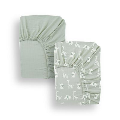 Este encantador set de cubre colchón está diseñado para brindarle a tu bebé la máxima comodidad durante el descanso. Confeccionado con algodón suave y transpirable, el set incluye 2 sábanas ajustable. El delicado estampado de jirafas y elefantes en tonos verde pastel crea un ambiente tranquilo y acogedor, perfecto para una noche de sueño reparador. Además, su ajuste elástico garantiza que la sábana permanezca en su lugar durante toda la noche. Fácil de lavar y duradero, es ideal para el uso diario.