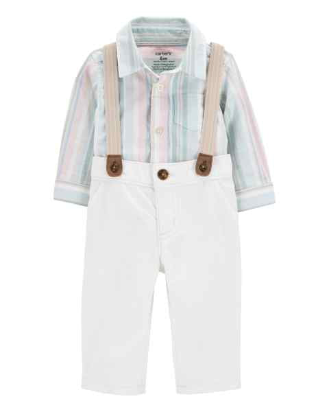 Este encantador conjunto de tres piezas es imprescindible para tu pequeño. Confeccionado en 100 % algodón, suave y transpirable, garantiza comodidad durante todo el día para su delicada piel. El body con botones al frente tiene hombros superpuestos para facilitar su colocación, mientras que los broches resistentes garantizan su durabilidad tras innumerables lavados y usos. El conjunto se completa con tirantes desmontables, que le dan un toque clásico al conjunto de tu pequeño.