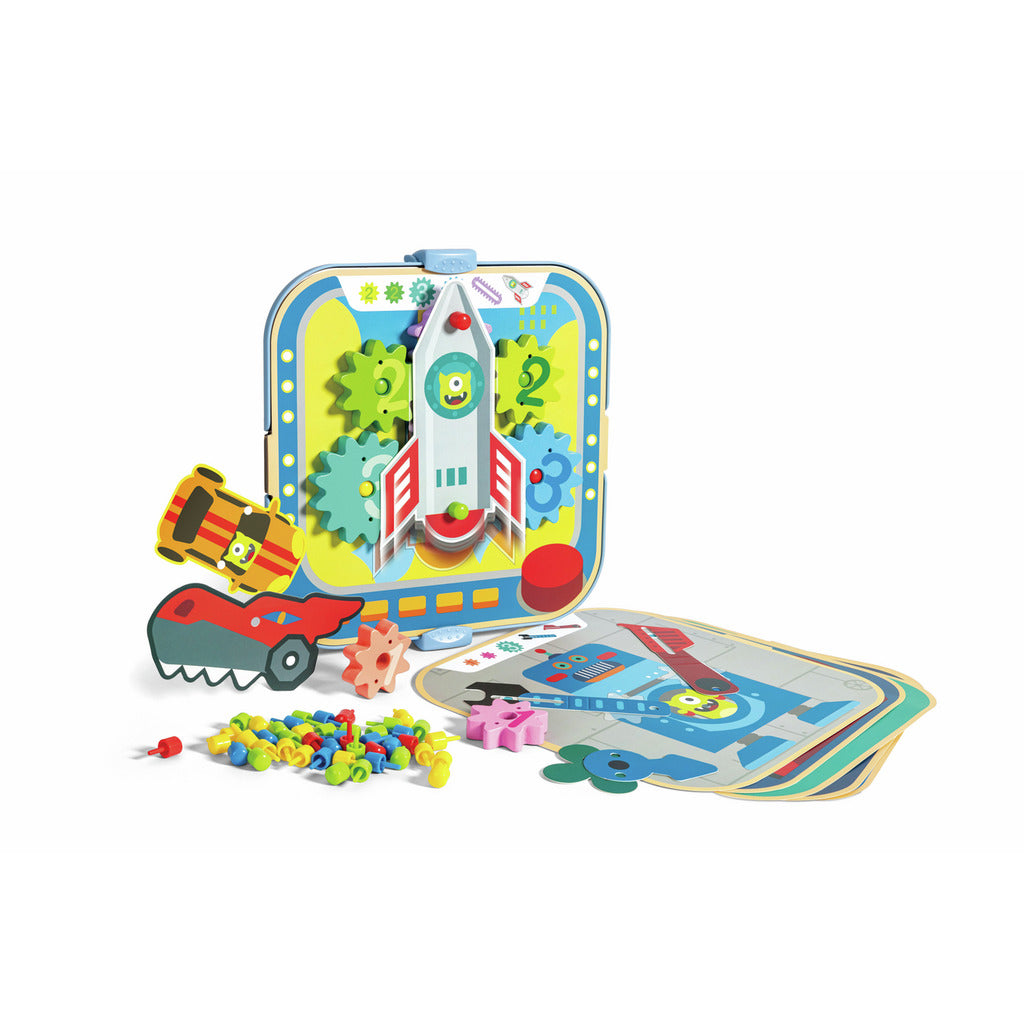 ¡Juega, dale vueltas y déjate sorprender por este maravilloso set de juguetes! ¡Coloca las clavijas, los piñones y las formas de cartón en uno de los seis fondos y dales vida girando los engranajes!