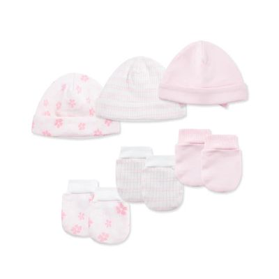 Gorros de algodón suave y manoplas resistentes a losarañazos se unen en esta colección de algodón orgánico para niñas reciénnacidas que las mantendrá abrigadas esta temporada.
