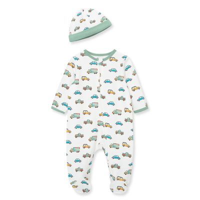 Prepárate para jugar con tu pequeño con este gorro y pijama para bebé recién nacido. Esta adorable pijama está decorado con carros de todos los colores. El conjunto es 100% algodón y se ajusta desde el escote hasta los pies para facilitar el vestir. Las mangas largas son perfectas para mayor comodidad.
