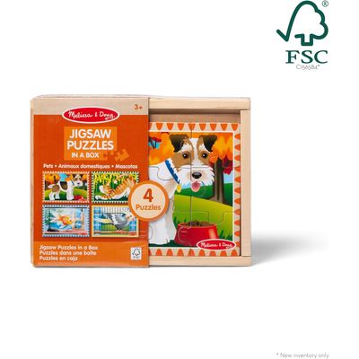 El Set de Rompecabezas de Madera – Mascotas de Melissa & Doug incluye 4 encantadores puzzles de 12 piezas con ilustraciones de animales domésticos: perro, gato, pájaro y pez. Cada rompecabezas se guarda en una práctica caja de madera con compartimentos individuales, ideal para mantener las piezas organizadas.