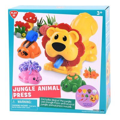 Juega al Set de masilla León. El juego de masilla contiene cuatro vasijas de masilla de colores, tres moldes de animales de la selva, dos herramientas para moldear y una máquina de masilla con forma de león.