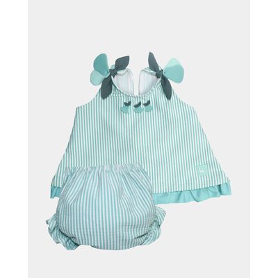 Este conjunto, de la colección Peras, está confeccionado conun tejido elástico de poliamida de lycra. Incluye un vestido y uncubrepañal. El vestido cuenta con un amplio escote en la espalda para facilitarsu colocación, y su lazo decorativo está cosido para evitar que se pierda. Elcubrepañal tiene gomas suaves y muy elásticas en las piernas, ideal para usarsobre el pañal o solo. Este versátil conjunto es apropiado para la playa uotras ocasiones. Además, ofrece protección solar UPF.